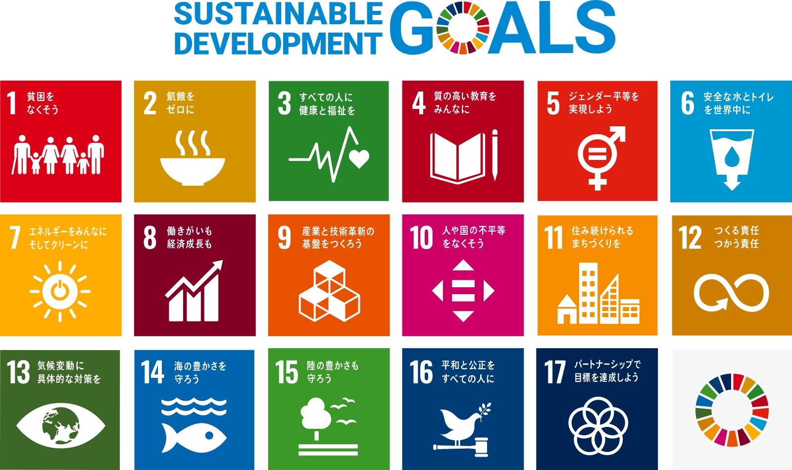 そんな課題を改善して、安心して暮らし続けることが出来る状態を2030年までに解決していこうという計画・目標がSDGs(Sustainable Development Goals:持続可能な開発目標)です。SDGsは17の目標と169のターゲットから構成されています。